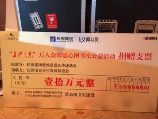 2016年初,晨報周刊攜手長房梅溪香山、長房集團(tuán)藍(lán)絲帶愛心傳遞基金共同發(fā)起“萬人眾籌圖書館”愛心公益活動,為湖南貧困山區(qū)學(xué)校捐建圖書室。以點(diǎn)亮希望之光、傳遞溫暖力量為主題的“長沙之光”微信文稿每被轉(zhuǎn)發(fā)一次,即為籌建山區(qū)學(xué)校愛心圖書室捐贈5元。活動開展以來,贏得了許多社會愛心人士的熱烈反響和廣泛共鳴,共有1萬余人次參與活動,最終,通過長房集團(tuán)藍(lán)絲帶愛心傳遞基金捐款10萬元,用于長沙縣福臨鎮(zhèn)古華山村梅林小學(xué)和寧鄉(xiāng)縣灰湯鎮(zhèn)洞庭橋完全小學(xué)兩所貧困學(xué)校愛心書屋的建設(shè),長沙市基少年發(fā)展基金會理事長羊舒麟代表兩所學(xué)校接收捐贈。